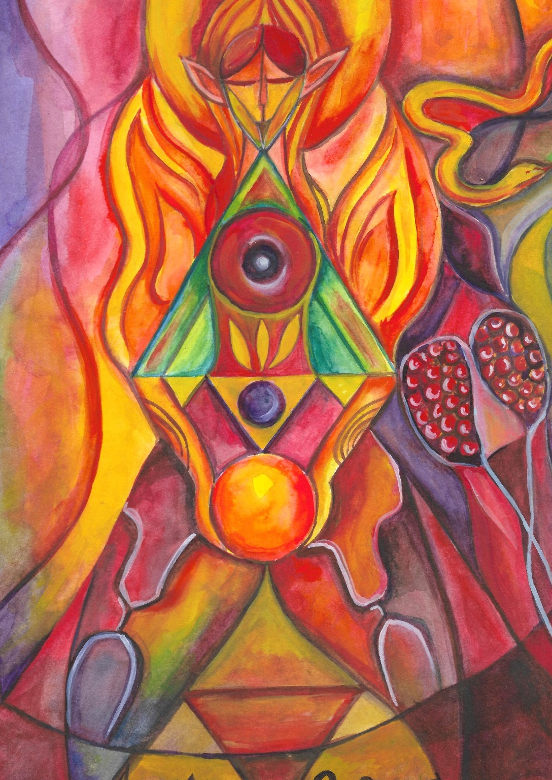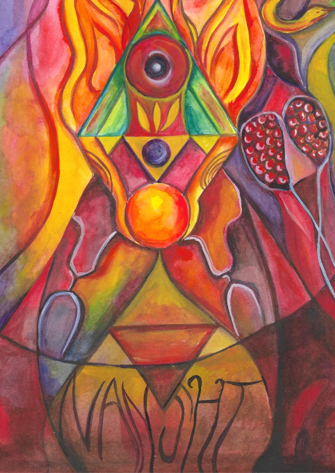 背景:《土中煉金人型系列-火之人型》,(局部) : 水彩手繪稿,A4,鄭楠蒔,2025。